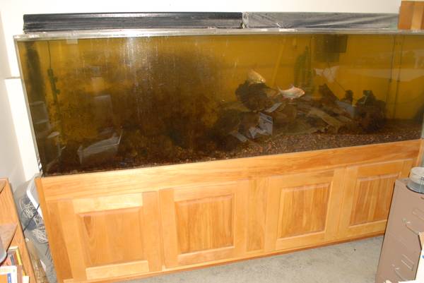 Well the family is growing and it is time to sell my 300 gallon tank. At one time I was very involved with raising African Cichlids and as colorful and entertaining as they are, they do need their own territory. So I thought, why not give them lots of space, after all, the bigger the tank, the more stable the water. I purchased the tank new- had a professional woodworker build a furniture grade stand and with 5 strong guys had them take it from the trucks to where it is now.
