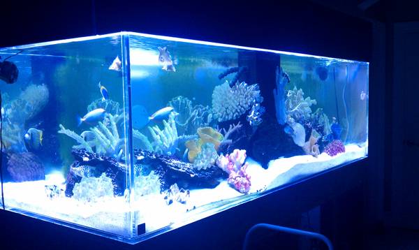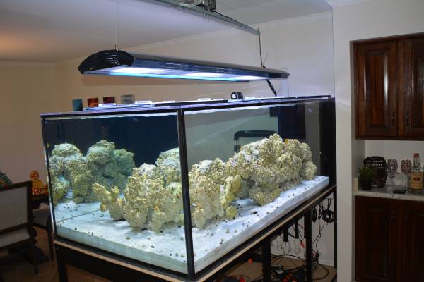 450 gallon acrylic aquarium made by “Clear for Life” 8’L x 3’W x 30″H with center/center overflow box. 1” thick acrylic. Viewable from all 4 sides. Shining WHITE sand with a few hundred pounds of live rock and many large coral skeletons and colored plastic corals. Water drains out of the over flow, into a 40 gal. open sump with a VERTEX ALPHA 300 Protien skimmer 2nd best skimmer on the market only next to its brother Bubble King (Both made in same factory and same materials). Skimmer has a OZOTECH POSEIDON 200 Ozone generator with its Ozotech Ozone Air dryer and of course a Milwaulkee ORP controller. Skimmer also has a Vertex Vexta self cleaning Head. The 40 gal. sump drains into a ECOSYSTEM 4216 REFUGIUM 55 gallons. with Mangrove plants, 50LB of MIRACLE MUD and macro algae. Little Giant 4MDQX 1325GPH pumps water into a JBJ Arctica Titanium 1/2HP chiller followed by a Aqua UV 40 Watt UV Sterilizer w/ Wiper. Top of the line filtration!! Water is then finally returned into the tank via REEFLO DART 3600GPH pump. 2 Jebao WP40’s and a Hydor Koralia Magnum 2200gph pump give great water flow through out the aquarium. 2 – 120w LEDs white/blue light up the aquarium, These lights are very strong and great, I have been able to grow everything from Soft corals, LPS, and SPS. All lights including the 2 refugium lights are on timers. Fish included are: 7″ Annularis Angelfish, 3.5″ Powder Blue tang, Melanuris Wrasse, 6line wrasse, Cleaner Wrasse and a diamond Goby. Also included are 400 Nassarius snails that keep the tank VERY clean. This is a turn key system ready for any type of fish or coral. I built this for serious reef keeping with no water changes needed. $5,000.