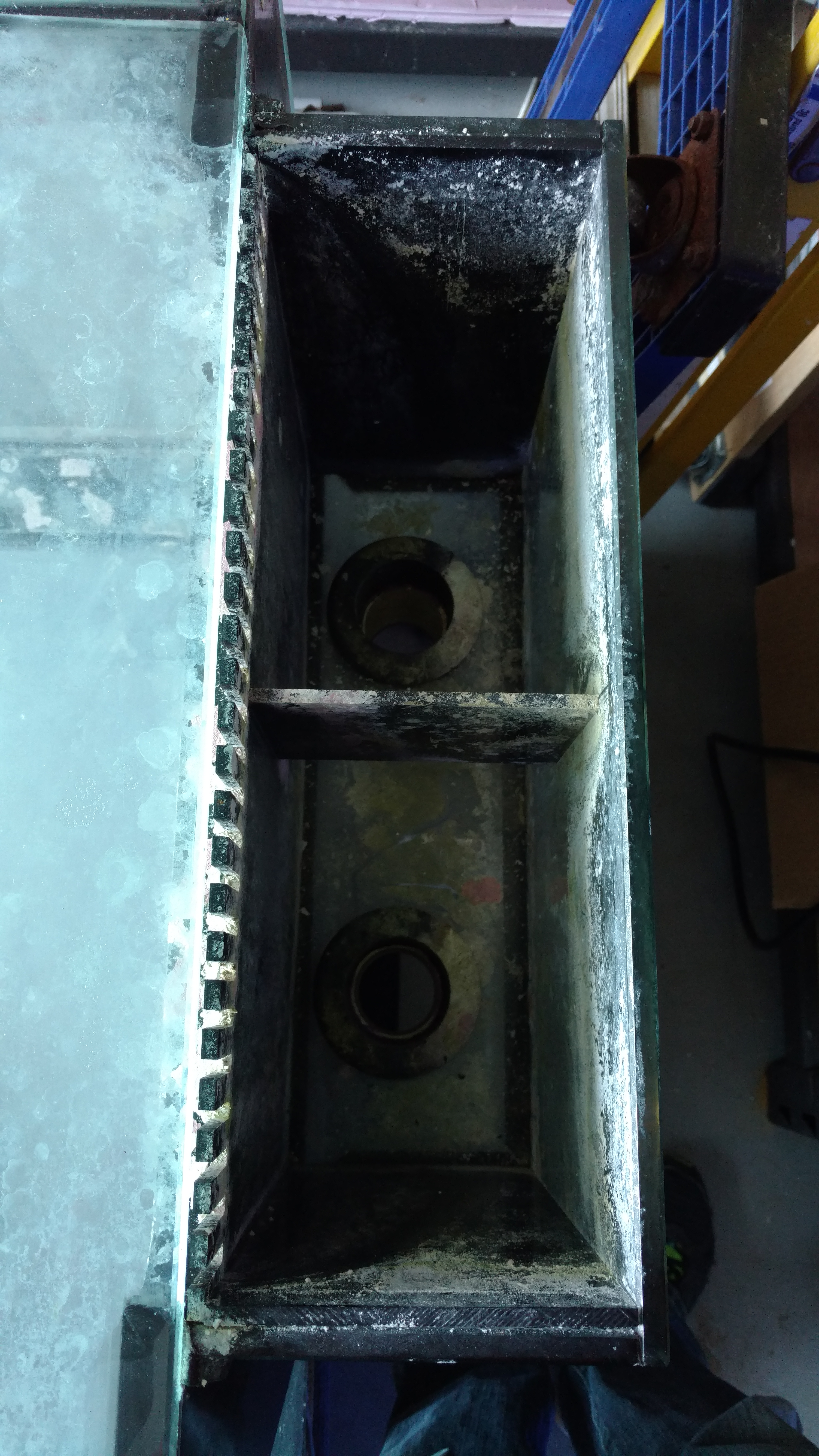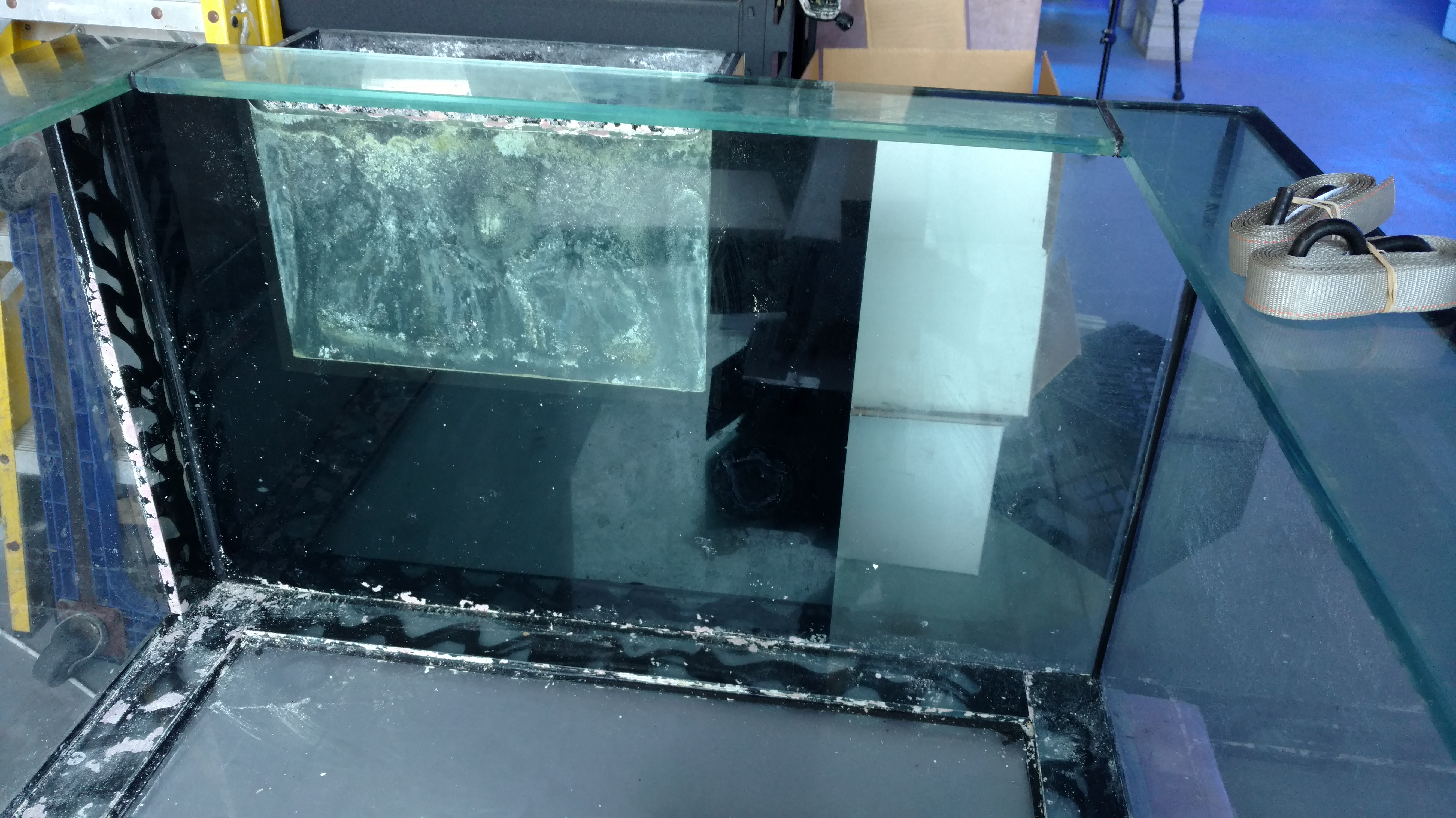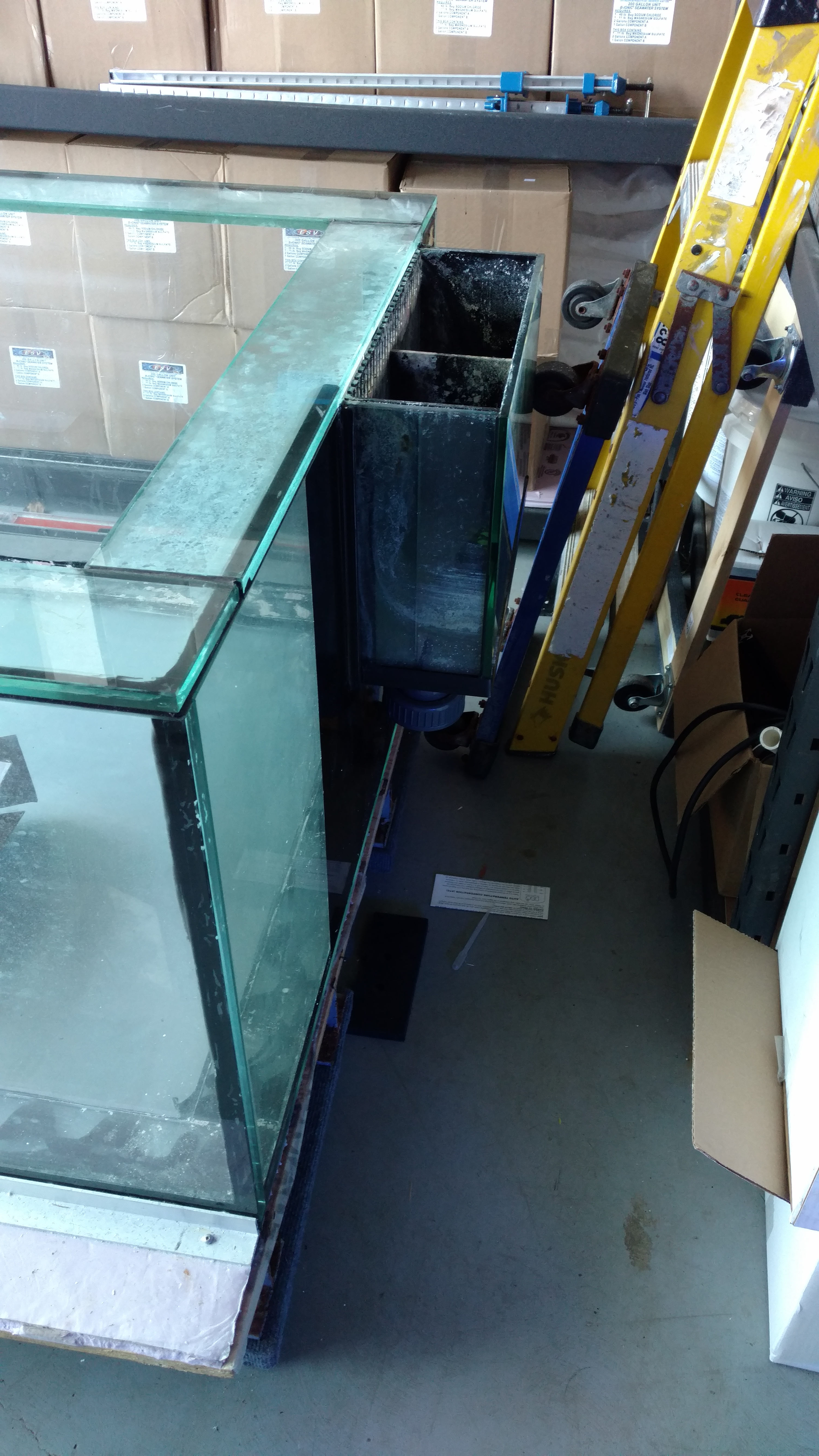 Used 180 gallon glass aquarium, 72 1/2″ x 18 1/2″ x 32″, L x W x H. This aquarium has an overflow box in the back right corner with 1 drain and 1 return hole. There are 2 additional holes in the bottom panel. It comes with a 36″ tall support stand, 29″ wet/dry filter and millwork facade.