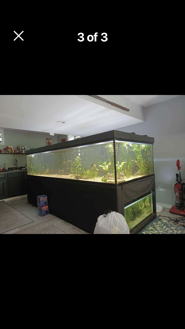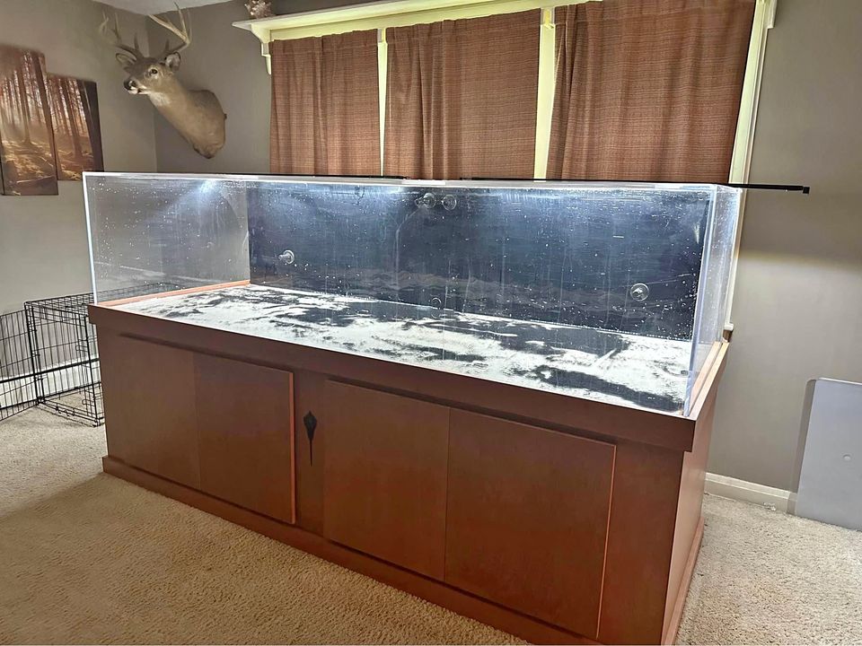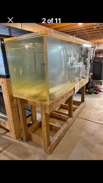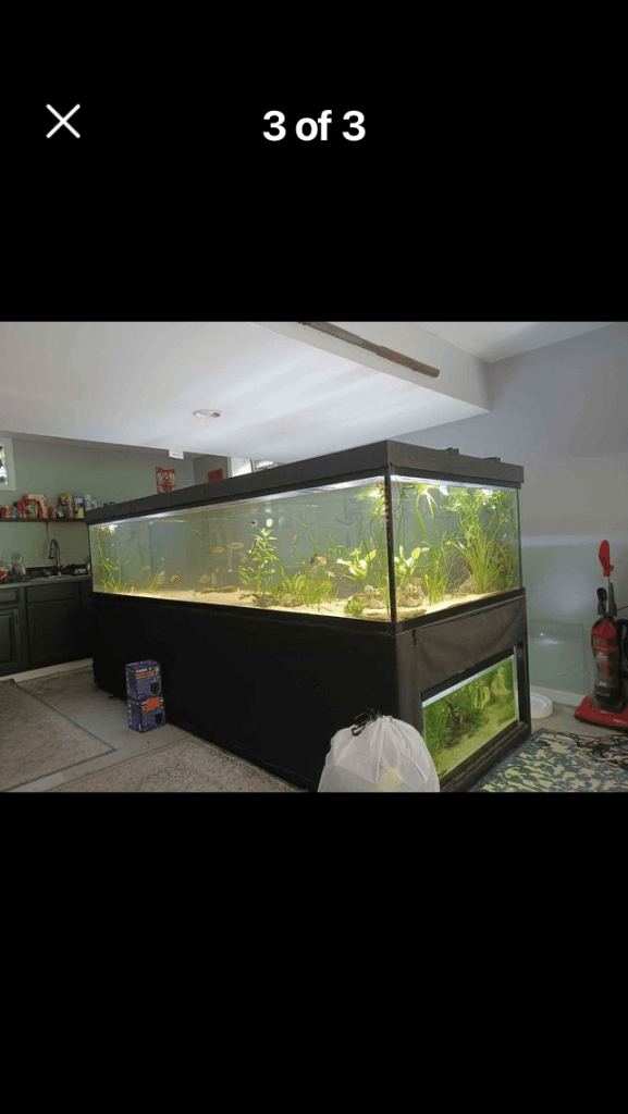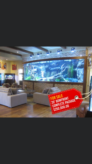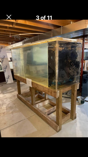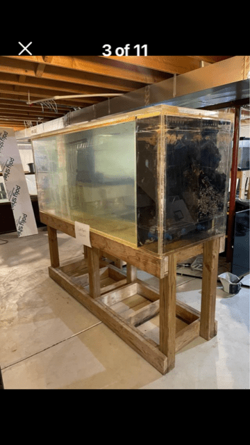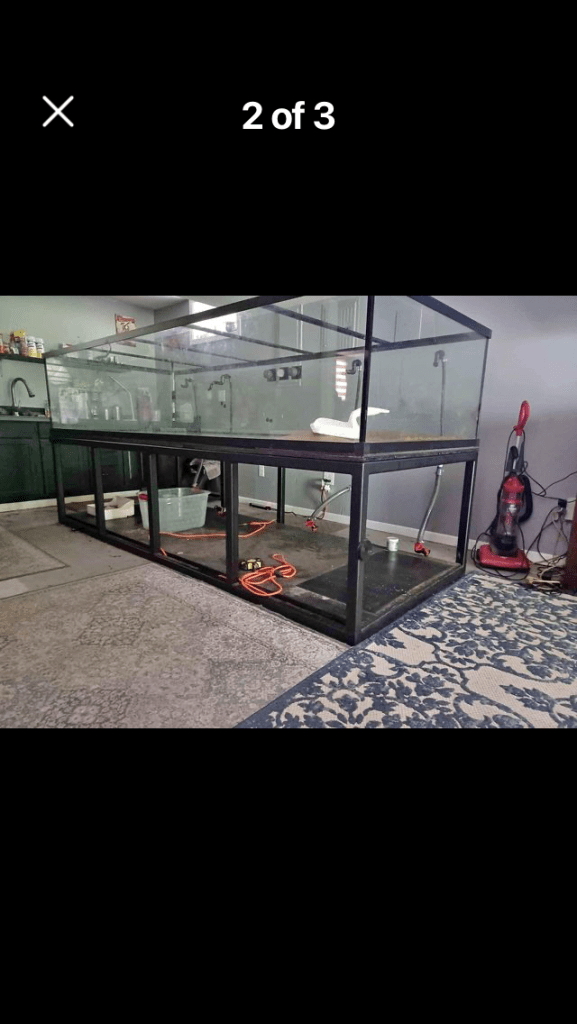 Comes with stand, custom cut glass tops, and custom built frames- to raise the glass, for the big fish that like to jump, so they don’t hit the glass so much. Set-up is new. Over $20k. Very nice tank!! Not all beat up and scratched. Price is very firm. Mike Brown- Facebook is contact.