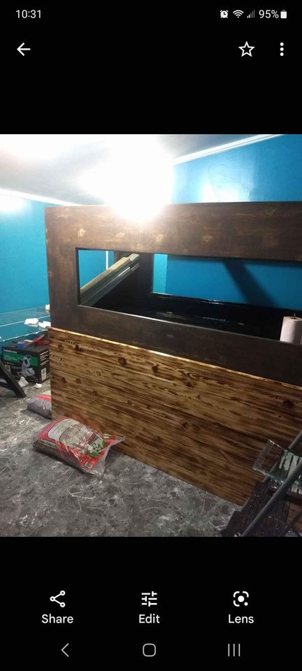 This is a 718 gallon plywood aquarium. I built it for some freshwater stingrays and an arowana. But unfortunately the starter tank crashed and I lost everyone. This tank is NOT complete it needs the viewing panels and finish plumbing. I do NOT have the viewing panels. When I went to install them I tightend the braces to much and broke the glass. It is VERY heavy and will need several people to move. The tank dimensions are 48″ x 96″ x 36″.The tanks and stand are both 36 in tall for a total of 72 in. The sump tank is a 75 gallon. There is an 8 foot Led light and supplies to make a second.