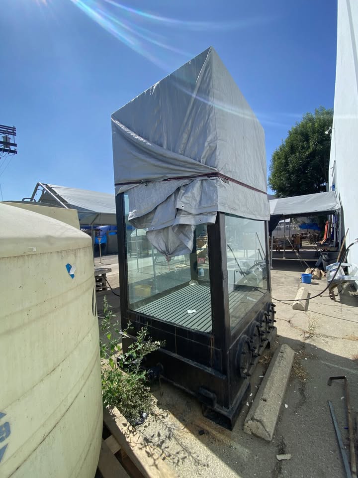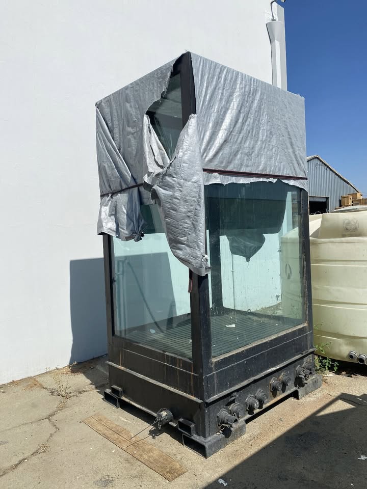 1631 Gallon Acrylic Water Tank on Steel Base w/ Slides Large 13′ tall 1631 Gallon Acrylic Water Tank with Steel Base featuring a steal industrial grade base with the styling of such to boot. The tank has 2″ thick acrylic walls fixed to a metal frame. The tank is over 8,000 pounds and features skids for easy moving with a forklift. Condition: This Prop shows signs of paint loss and wears, being a formal prop rental. It is fully functional and comes with pumps and filtration for use on set or personal use. Please feel free to write us with any questions or requests. This item is SOLD AS-IS and is for LOCAL PICKUP in Van Nuys, California. We can help arrange to ship if needed simply sent us a message for a quote. Please make sure to have a large truck for pickup as this piece is very large. This auction includes an item that is a formal prop rental for the movie industry and will show signs of wear and tear from years of use and service. Measurements 13′ Tall X 64″ Wide X 52″ Deep